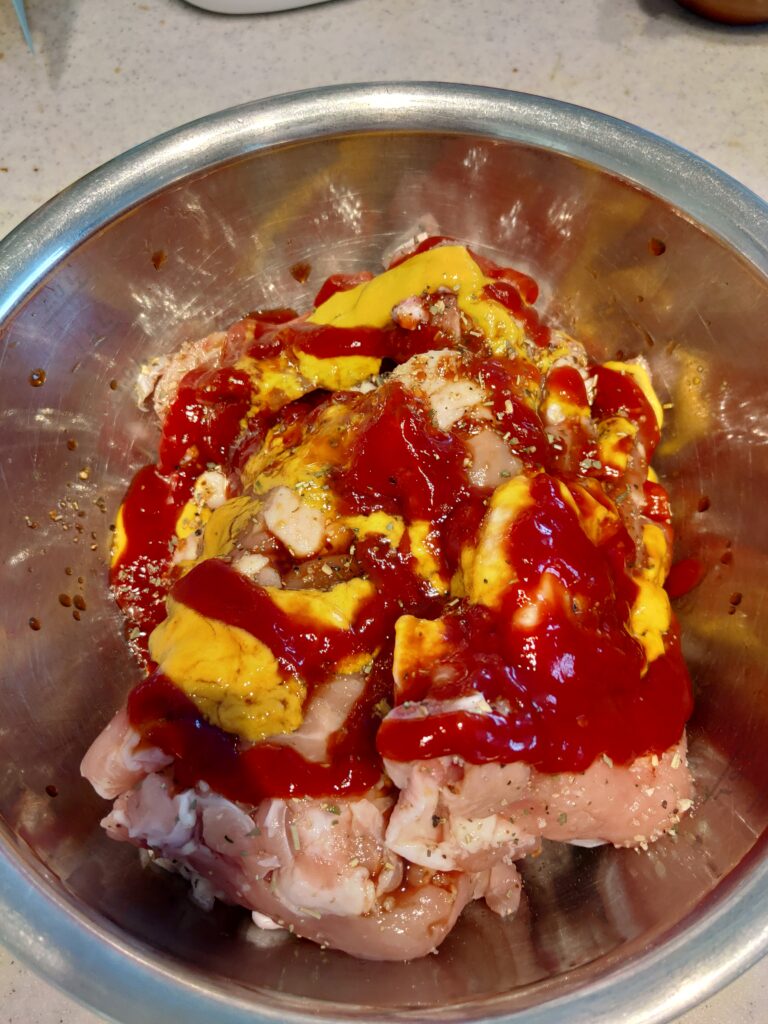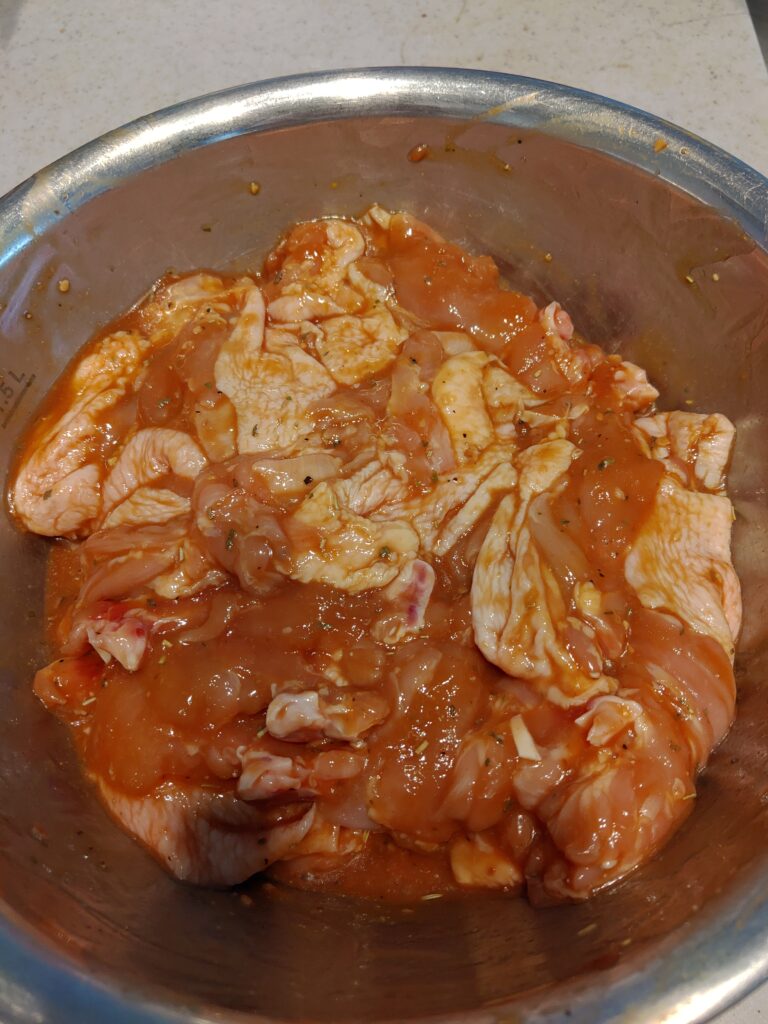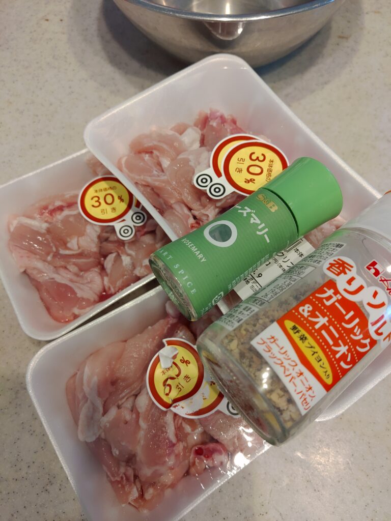 まず初めに、ボールに肉を入れます。(洗い物がめんどい人は骨付き肉なので、ジップロックなどの厚めの袋に入れてください)