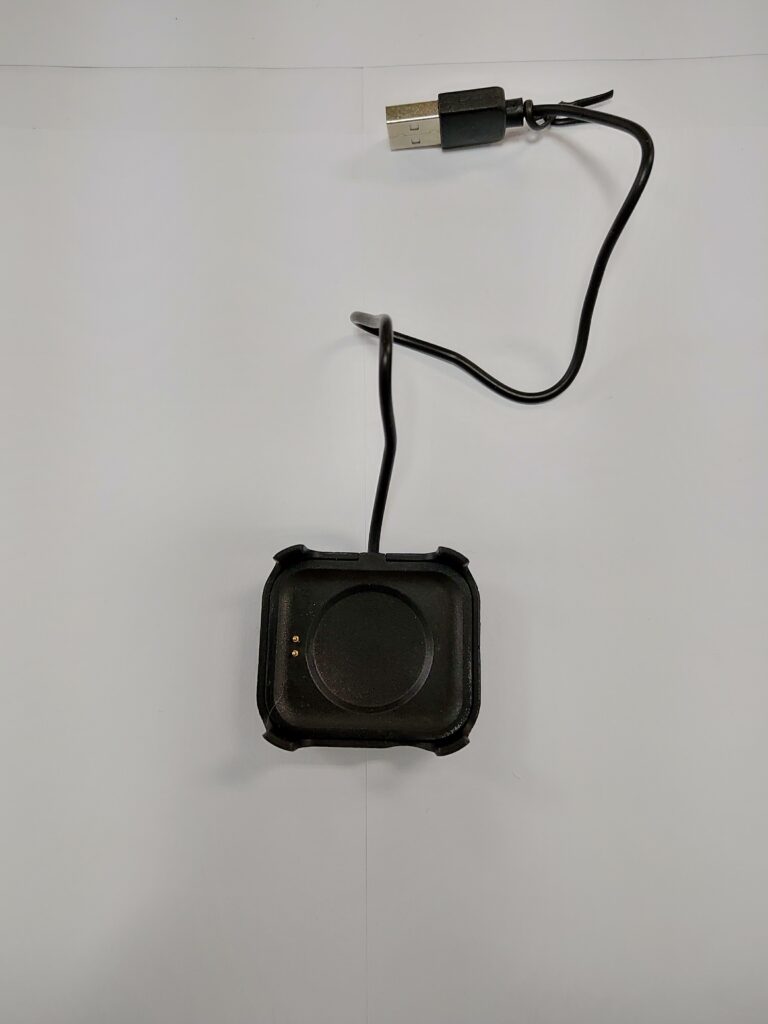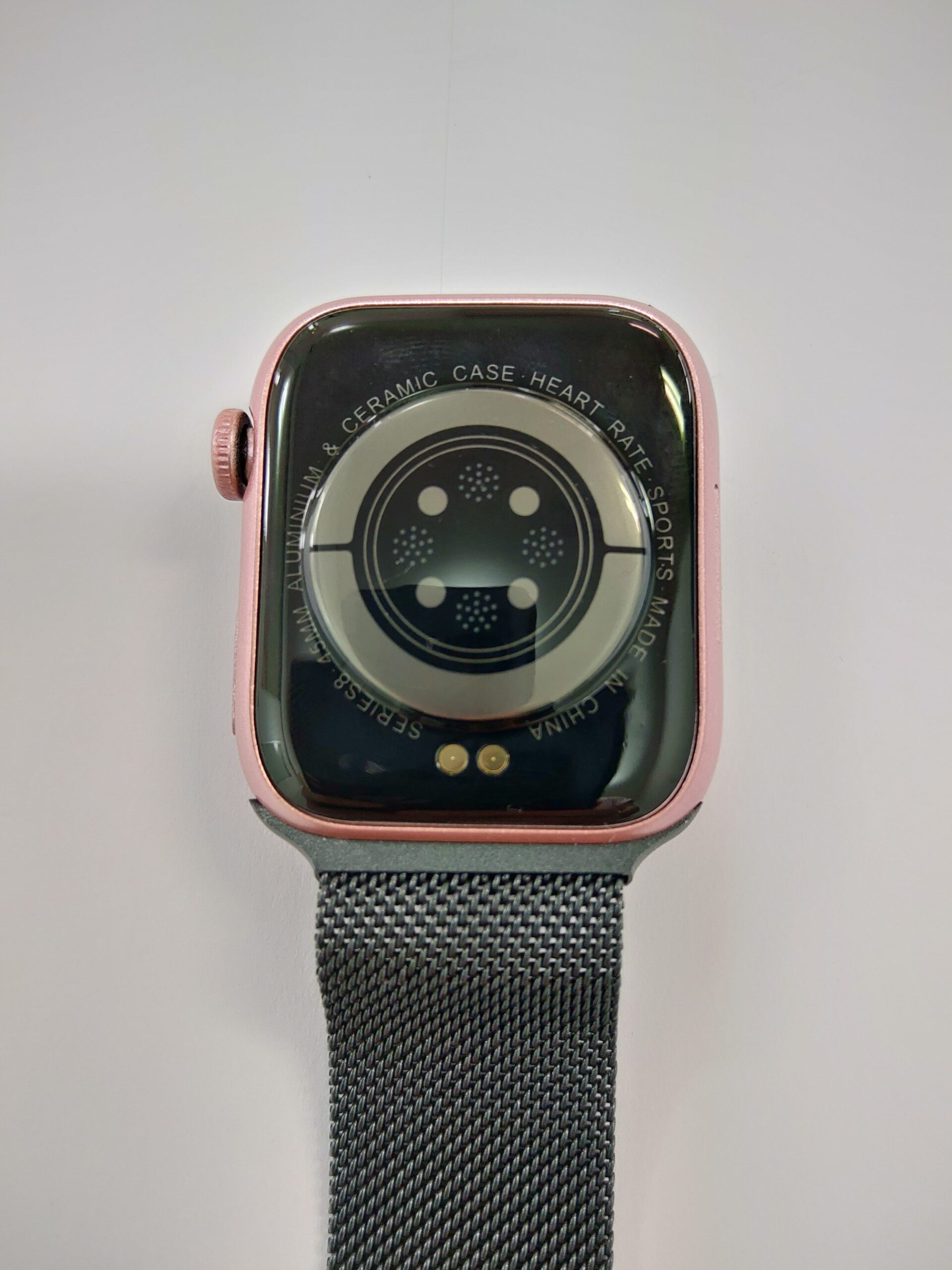 時計の背面です。バイタルチェック用のLED?、充電用の端子です。