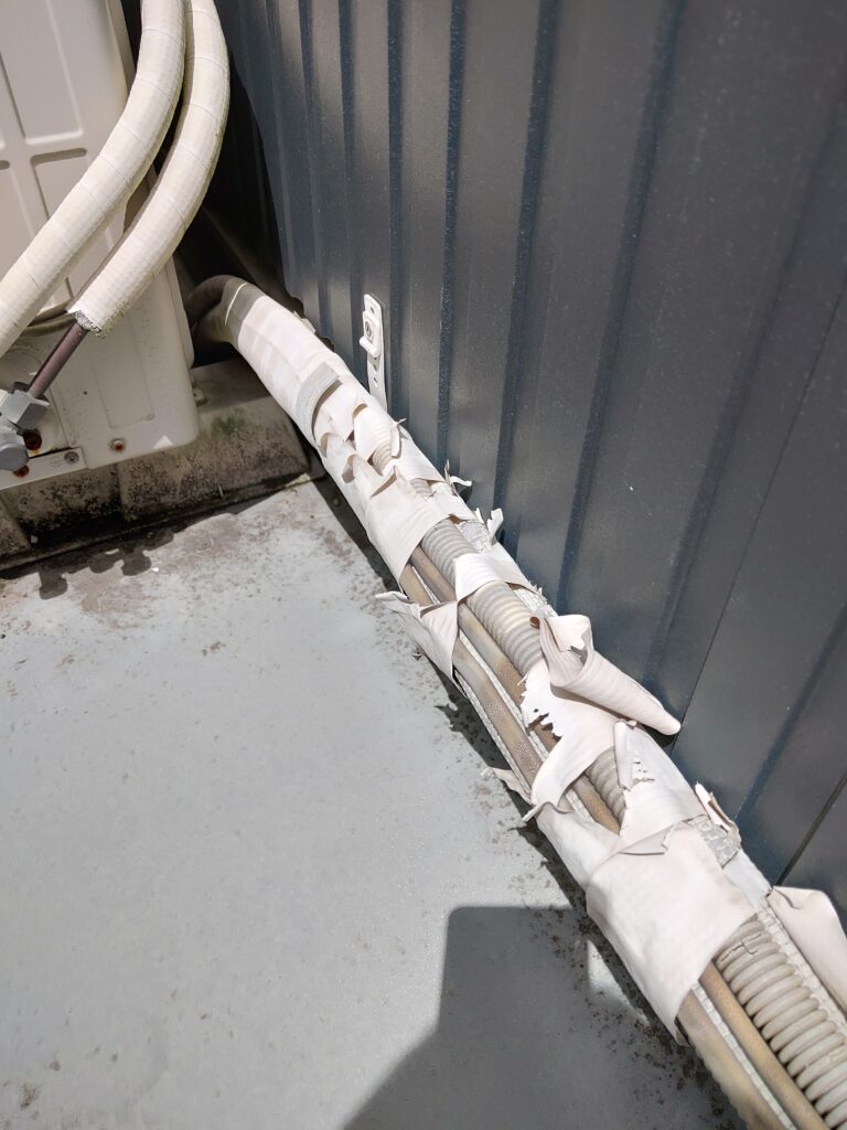 これに、どこかから舞ってきた葉っぱとか、エアコン室外機のホースを巻く補強材?も経年劣化で剥がれ落ちて排水溝に詰まってました。付近に二階ベランダにまで届くような木などはないのに不思議ですね。